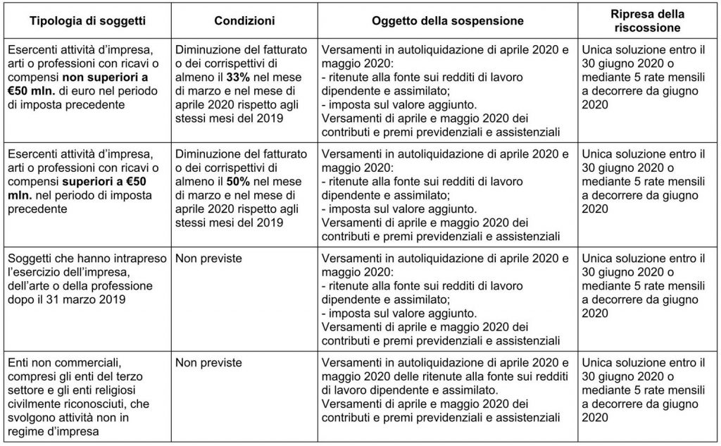 Il decreto, infatti, al fine di permettere alle imprese di far fronte alla crisi di liquidità causata dall’emergenza sanitaria in atto, estende a tutte le imprese, a prescindere dall’attività economica concretamente esercitata o da limiti dei ricavi o compensi dell’esercizio precedente, la sospensione dei versamenti in autoliquidazione in scadenza nel mese di aprile 2020 e nel mese di maggio 2020, relativi alle ritenute alla fonte sui redditi di lavoro dipendente e assimilato, all’imposta sul valore aggiunto e ai contributi previdenziali e assistenziali, nonché ai premi per l’assicurazione obbligatoria, purché l’impresa abbia subito una contrazione del fatturato rispetto ai mesi di marzo e aprile relativi al periodo d’imposta precedente, di almeno il 33%, detta percentuale è innalzata al 50% qualora i ricavi e/o i compensi siano superiori a 50 milioni di euro.